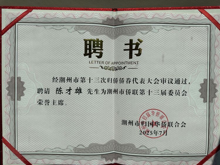 在本次会议中,北京潮商会会长、北京市京潮公益基金会主席陈才雄被聘为国际潮团总会荣誉会长。