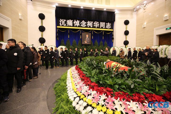 八宝山殡仪馆大礼堂庄严肃穆,哀乐低回。正厅上方悬挂着黑底白字的横幅“沉痛悼念柯华同志”,横幅下方是柯华同志的遗像,柯华同志的遗体安卧在鲜花翠柏丛中,身上覆盖着鲜红的中国共产党党旗。