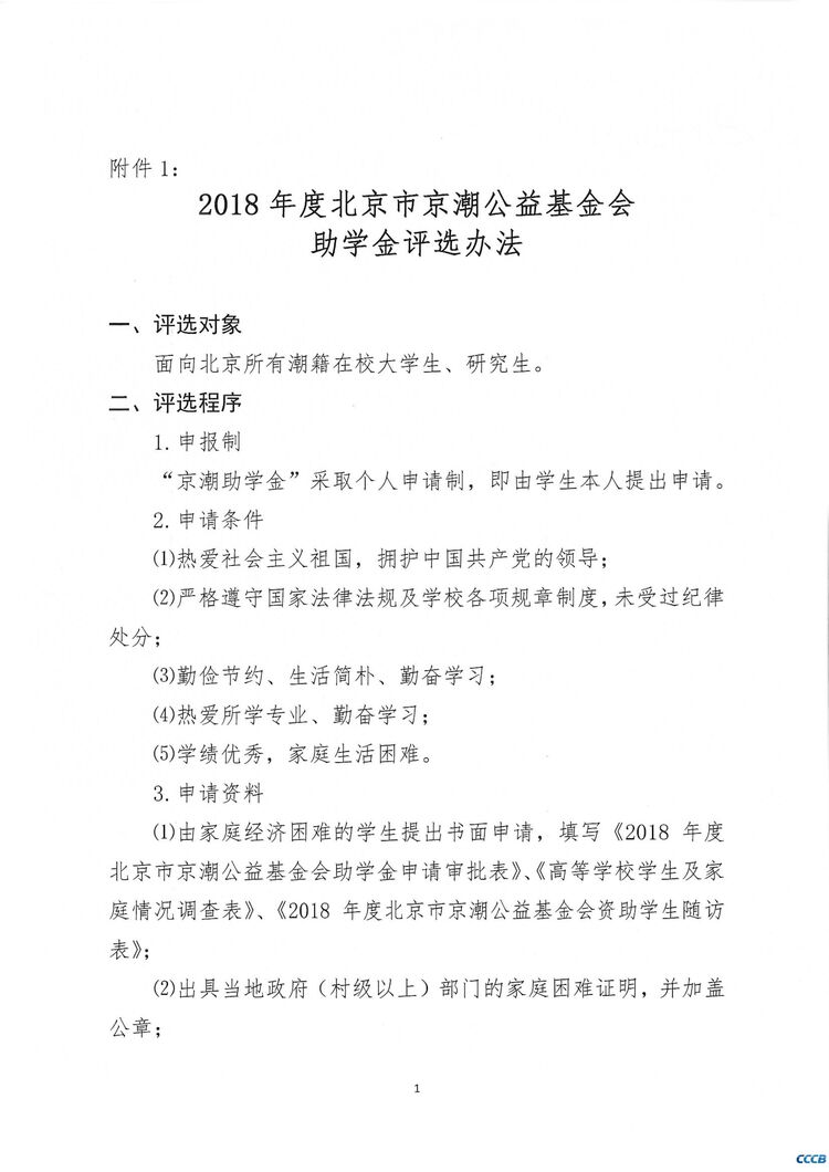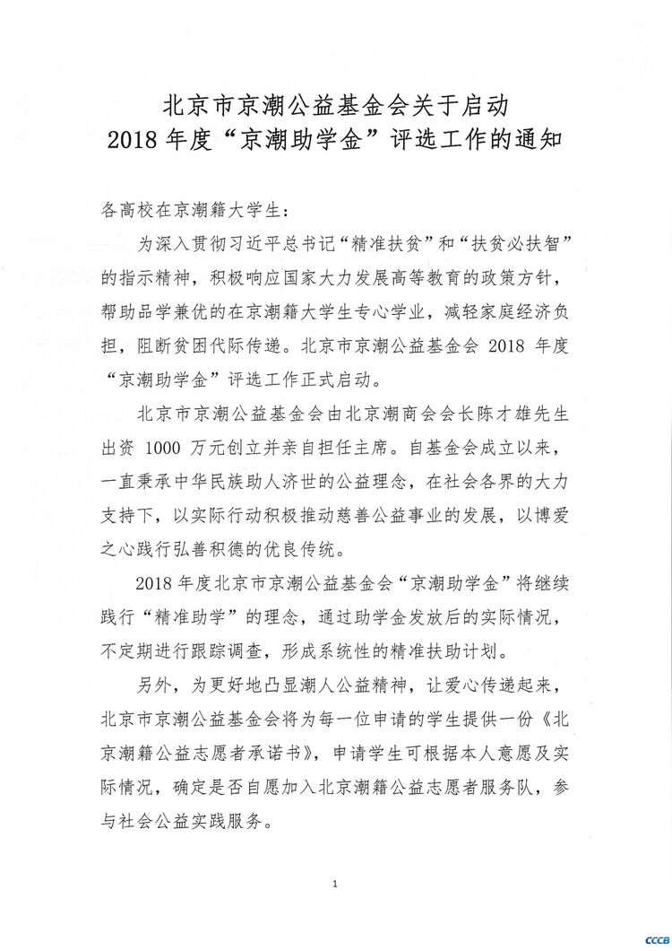 首页 重大活动 正文 【通知】北京京潮公益基金会2018年度助学金评选正式启动 发布时间 : 2018-12-27 17:21 1701 文件下载链接:http://www.cccb.org.cn/upload/201812/ 更多资讯请关注 北京潮商会微刊公众号 cccb168