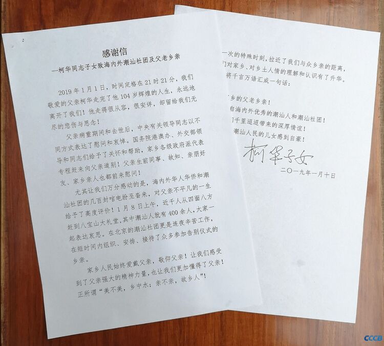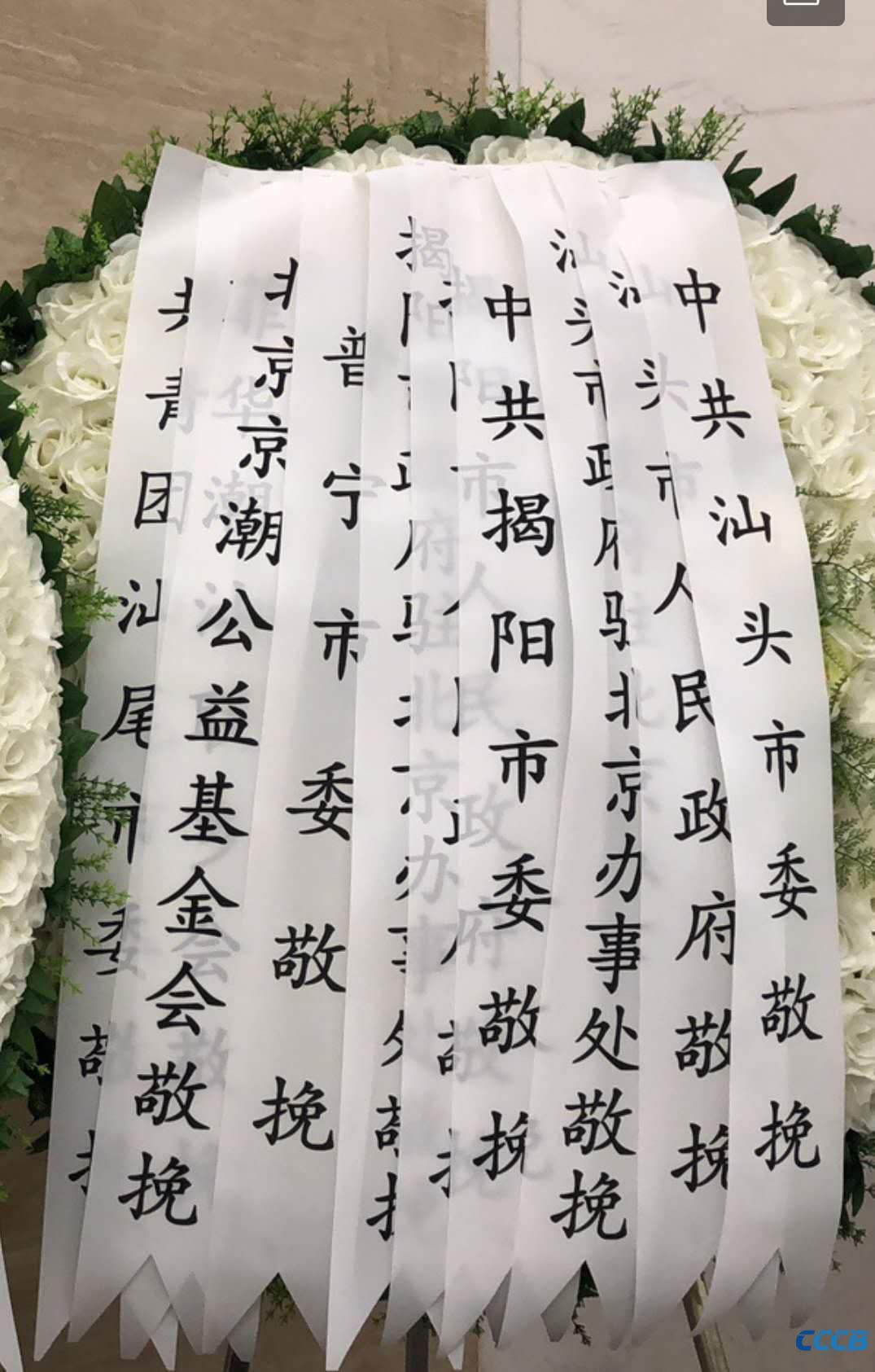 尤其让我们万分感动的是,海内外华人华侨和潮汕社团的几百封唁电纷至沓来,对父亲不平凡的一生给予了高度评价!1月8日上午,近千人从四面八方赶到八宝山大礼堂,其中潮汕人就有400余人,大家一起表达哀思。在北京的潮汕社团更是连夜辛苦工作,在短时间内组织、安排、接待了众多参加告别仪式的乡亲。