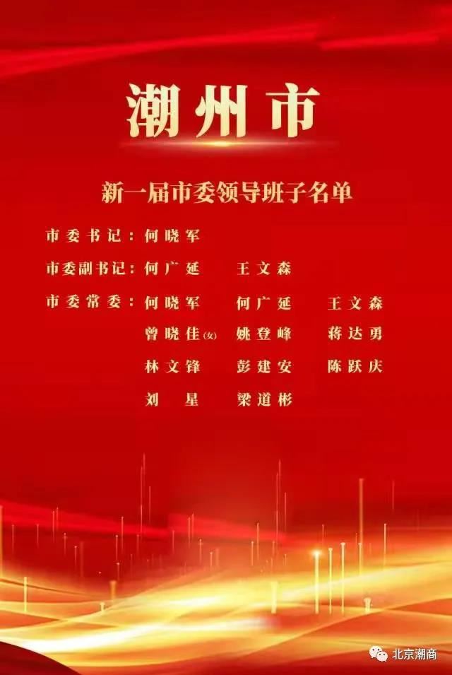 何晓军,男,汉族,1972年7月生,在职研究生,经济学博士,中共党员,当选为潮州市委书记。
